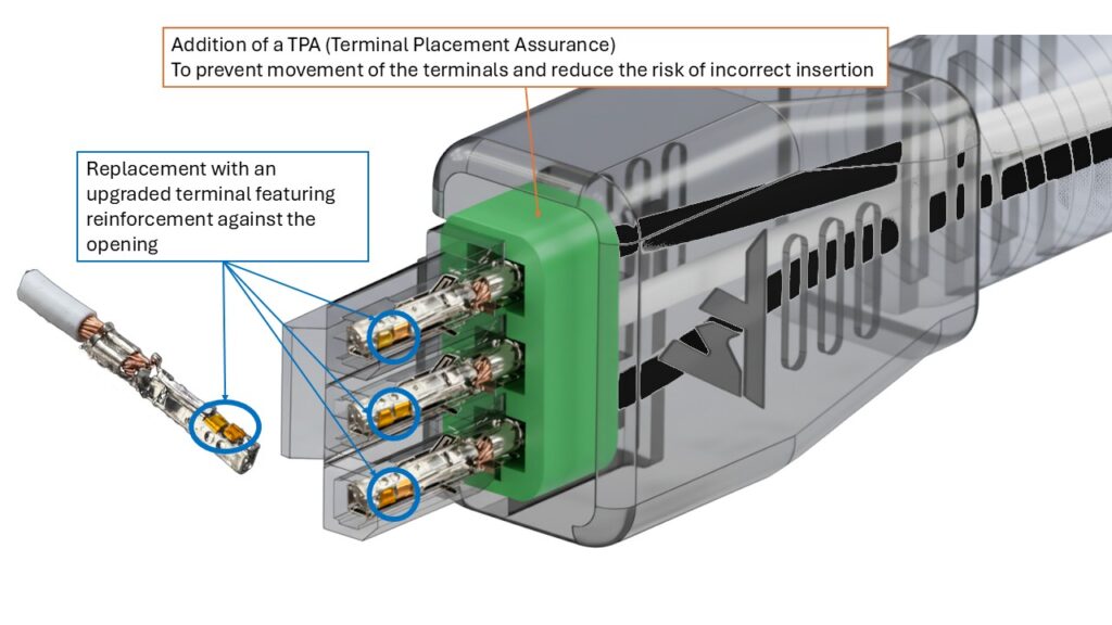 Corrective action to stop the disconnections: replacement of the terminal and addition of a TPA. As a result, your T598’s power supply unit must be replaced with a new part that has a new female connector whose terminal perfectly matches the tight micro-dimensional tolerances of the male connector on the base.