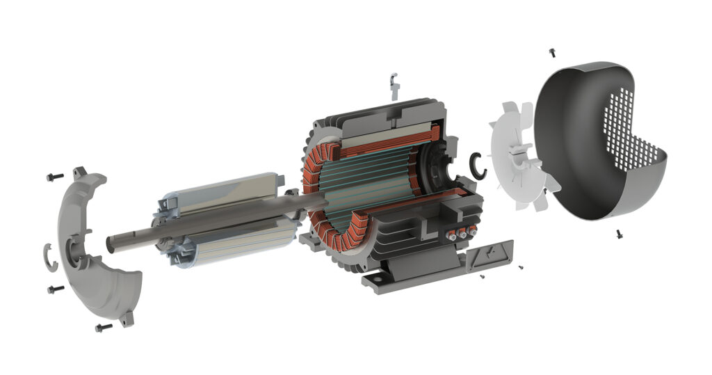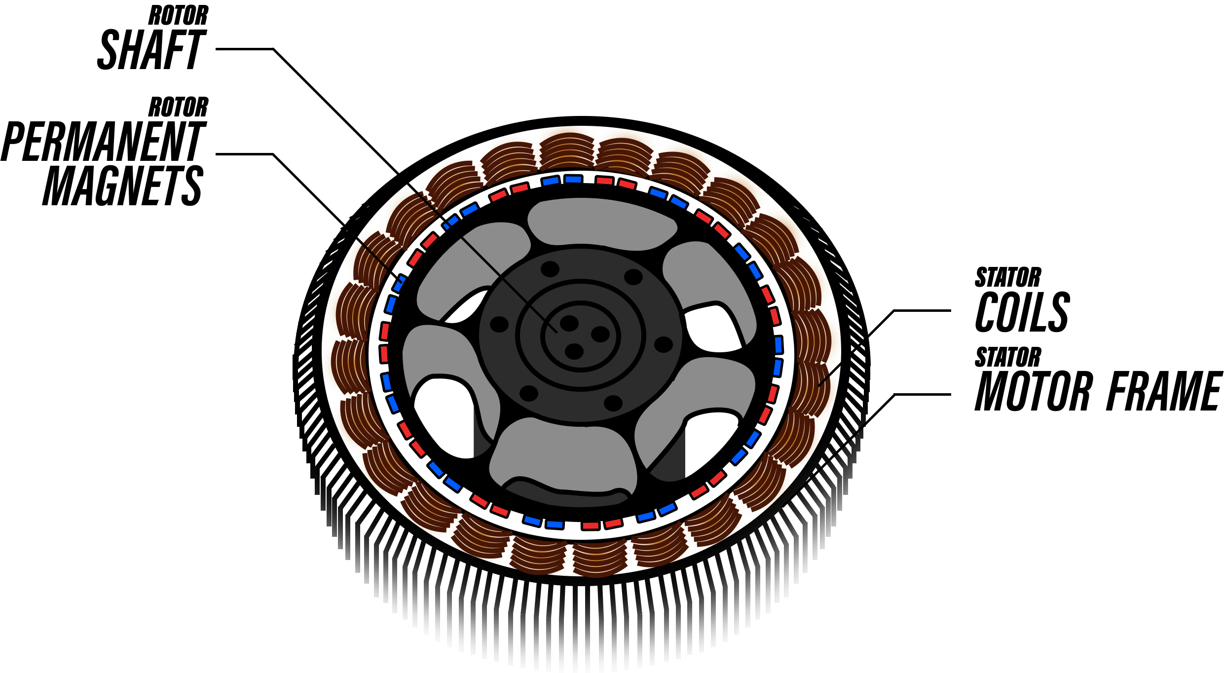 The rotor is therefore the only part that moves in the motor. It does so by using a basic physics mechanism: magnetism. As electricity flows through the stator coils, they become magnetic and start reacting with the magnets on the rotor, making it move. This was theorized and proved about 200 years ago by Michael Faraday, which we better know today as Faraday’s Law of Induction.