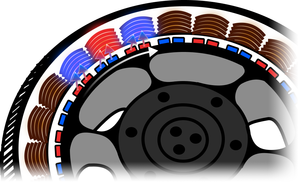 Cogging is an undesired effect of the First-Generation Direct Drive typology, and there are two reasons why it happens. First, let’s have a look the motor design. You can see that the magnets (coils and rotor magnets) want to align with each other, and that alignment defines the rotation of the wheel thanks to the shaft