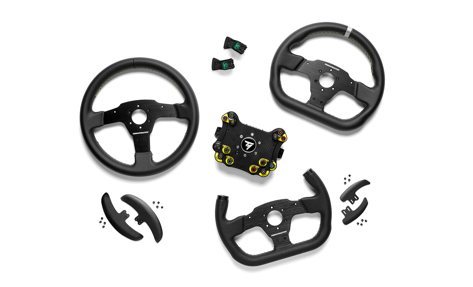 Set your own rules with the EVO Racing range. Combine EVO Racing Hub with rims (2.3-inch / 58-mm PCD [Pitch Circle Diameter]) and paddle shifters of different sizes, shapes and finishes, as well as with fully configurable analog paddle shifters (all sold separately) to dominate any track in the vehicle and racing discipline of your choice. Adjust the positions of the thumb button modules to your liking for optimal handling, and customize the look with the included stickers.