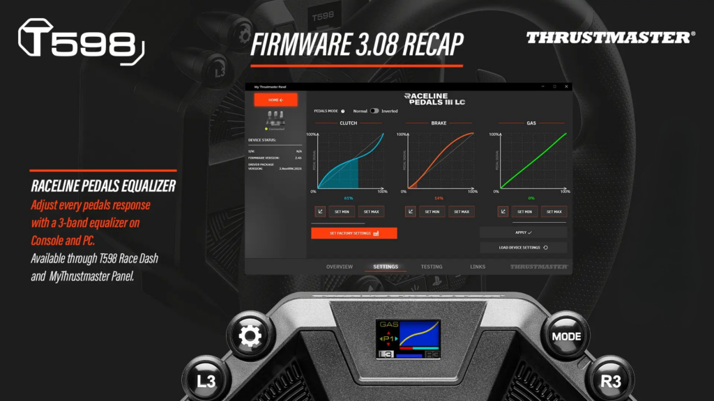 The latest firmware releases for the T598 for PlayStation (v3.08) and the T598 for Xbox (v1.60) introduce major improvements designed to refine the driving experience, expand device compatibility, and bring deeper immersion to sim racers across consoles and PC.