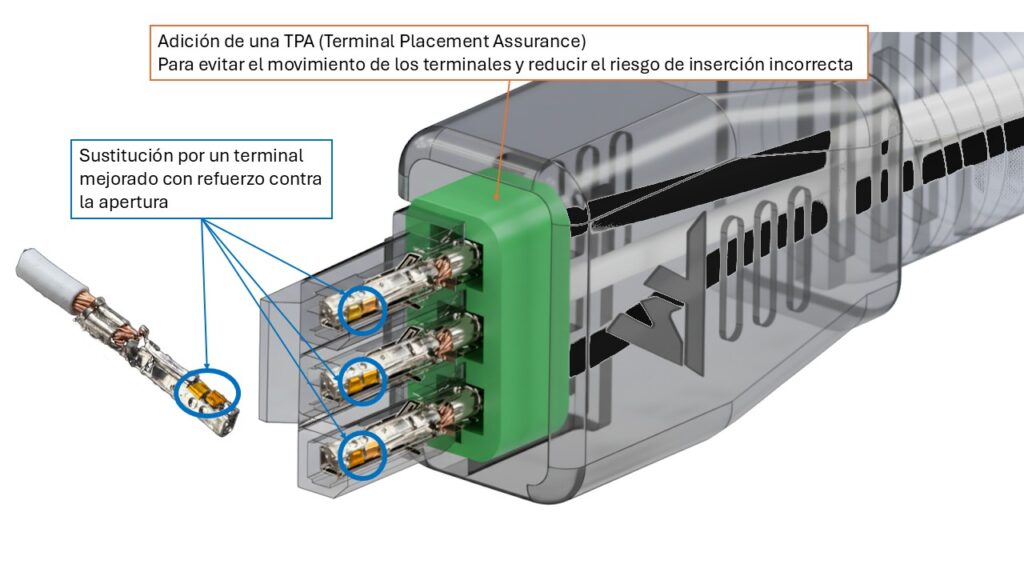 ➔ Acción correctiva para detener las desconexiones: sustitución del terminal y añadido de una TPA. Como resultado, la fuente de alimentación del T598 debe sustituirse por una nueva que tenga un nuevo conector hembra cuyo terminal coincida perfectamente con las estrechas tolerancias microdimensionales del conector macho de la base.