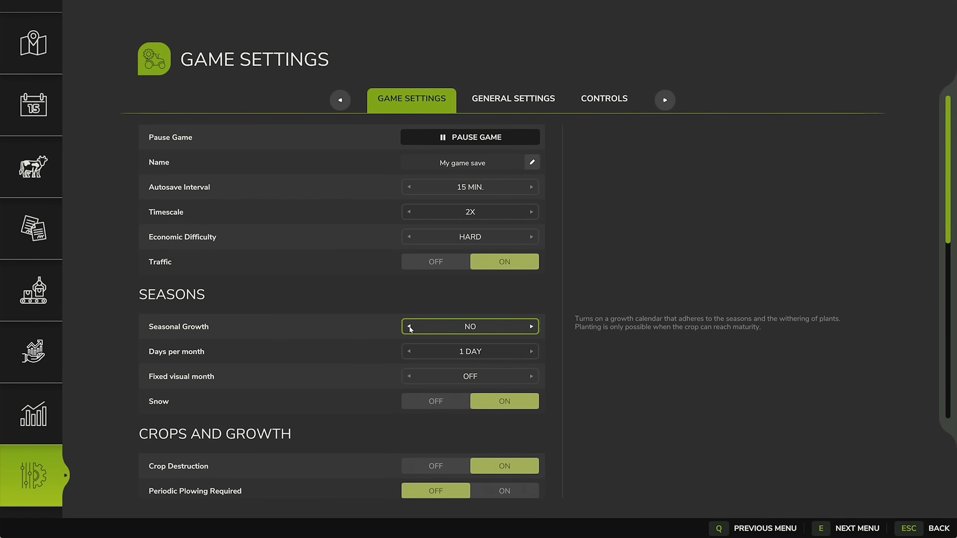 Bonne nouvelle pour désactiver la croissance saisonnière c’est très simple ! Vous pouvez désactiver cette option en accédant au menu du jeu puis en appuyant sur la touche échap sur PC ou le bouton de menu sur Xbox ou PS5. Faites défiler jusqu’à l’icône avec la roue dentée, sélectionnez “Paramètres de jeu” et désactivez la croissance saisonnière. Vous pourrez toujours la réactiver plus tard, une fois que vous serez à l’aise avec les autres aspects du jeu et que vous serez en quête de réalisme.