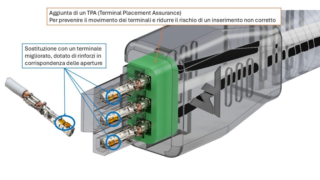 ➔ Azione correttiva per impedire gli scollegamenti: sostituzione del terminale e aggiunta di un TPA. Come risultato, l’alimentatore del tuo T598 deve essere sostituito con un nuovo elemento dotato di un nuovo connettore femmina, i cui terminali rispettano perfettamente le strette tolleranze micro-dimensionali del connettore maschio della base.