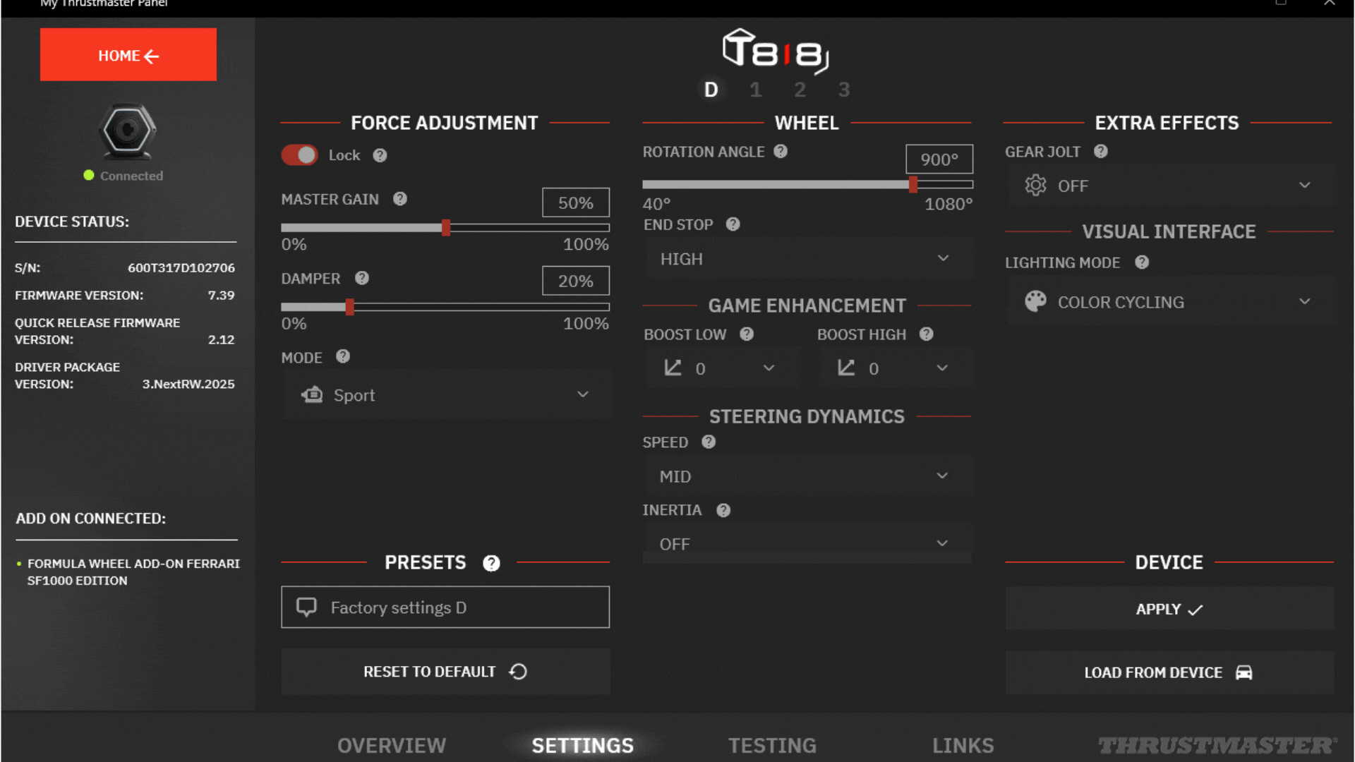 The My Thrustmaster Panel has been updated to provide a clearer, more intuitive user experience, making it easier than ever to manage firmware updates, customize settings, and monitor your T818 performance.