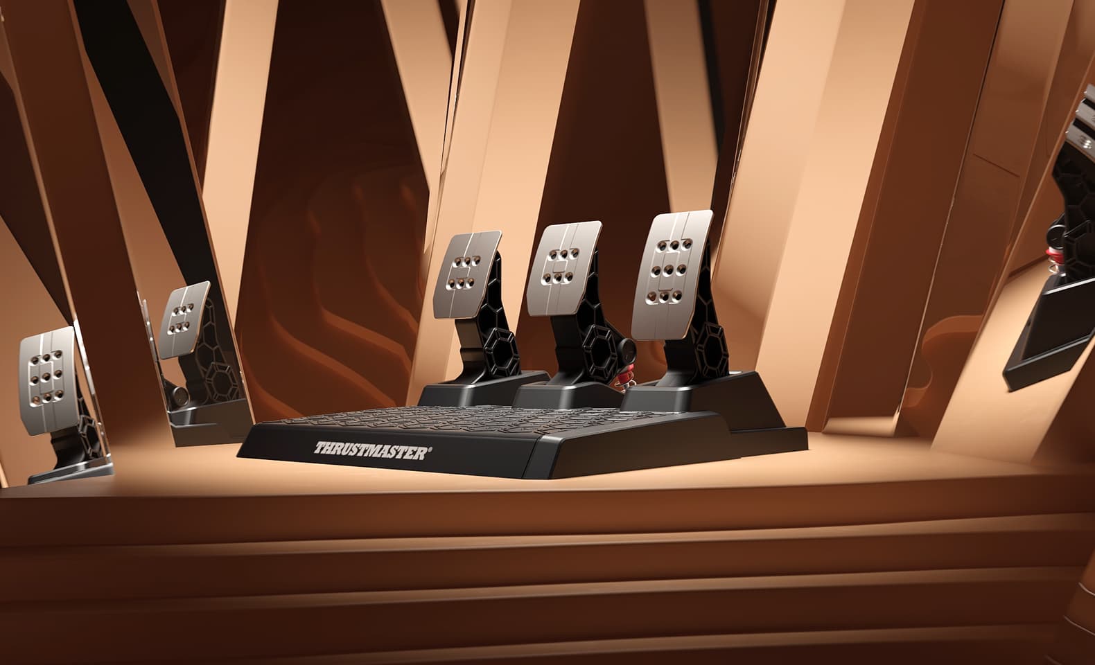 Zestaw pedałów T3PM dołączony do kierownicy T248 zawiera 3 pedały magnetyczne, które zapewniają jeszcze bardziej liniowe przyspieszanie i hamowanie. Z pedałem hamulca dostarczane są różne sprężyny, które umożliwiają regulowanie jego oporu. Jest to spora zaleta, jeśli chodzi o dobór optymalnej skuteczności hamowania od 350 do 100 kilometrów na godzinę przed ostrym zakrętem.